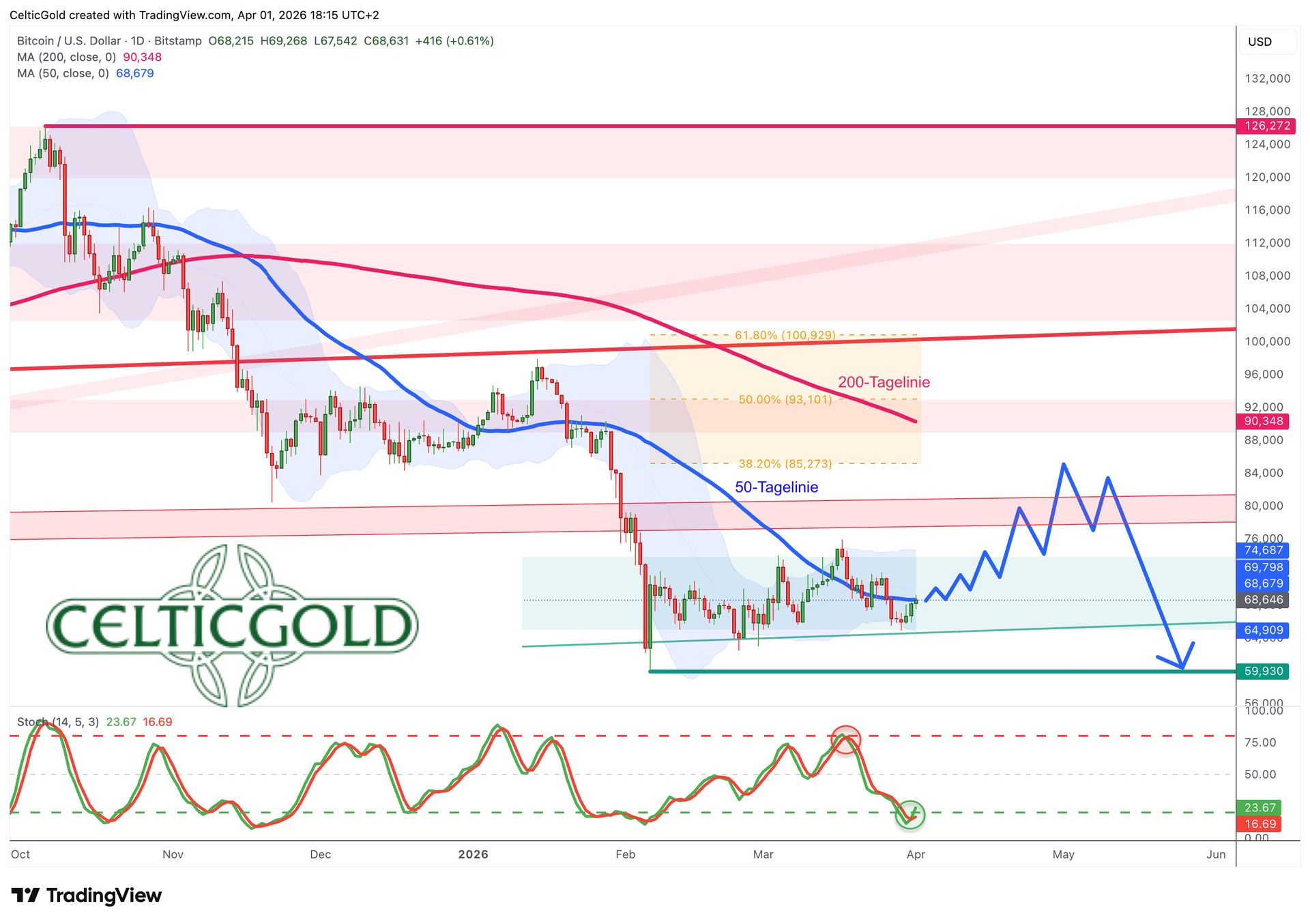 Seit dem Paniktief am 6.Februar 2026 und einem Tiefstkurs bei 59.930 USD bemüht sich der Bitcoin seit nunmehr fast zwei Monaten um eine Stabilisierung. Dabei ist bislang lediglich eine kurzlebige Erholung bis auf 76.013 USD herausgekommen, welche aber in dem aktuell äußerst schwierigen geopolitischen Umfeld schnell wieder in sich zusammenbrach. Unterm Strich bleibt eine Seitwärtsbewegung zwischen primär ca. 65.000 und 70.000 USD. Dabei fielen die Schwankungen angesichts der geopolitischen Verwerfungen und der teilweise starken Kursverluste an den Aktien- und Edelmetallmärkten im Kryptosektor überraschend moderat aus.