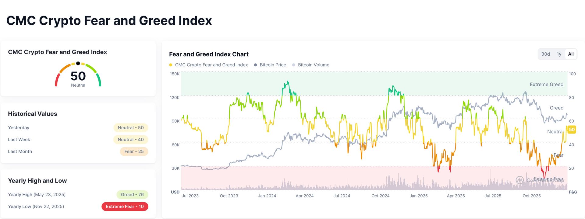 Der „CMC Crypto Fear & Greed Index“ von CoinMarketCap, der den breiteren Kryptomarkt (inklusive Top-10-Coins und Stablecoin-Dynamiken) abbildet, steht aktuell bei 50 von 100 und spiegelt damit ebenfalls eine ausgeglichene, neutrale Stimmung im Kryptomarkt wider. Die analysierten Indikatoren wie Marktvolatilität, Momentum, Social-Media-Aktivität, Umfragen und Bitcoin-Trends deuten im Kollektiv auf eine Fortsetzung der Konsolidierung hin.