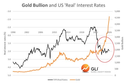 Gold vs. und reale US-Zinssätze, vom 16. Januar 2026. Quelle: GLI