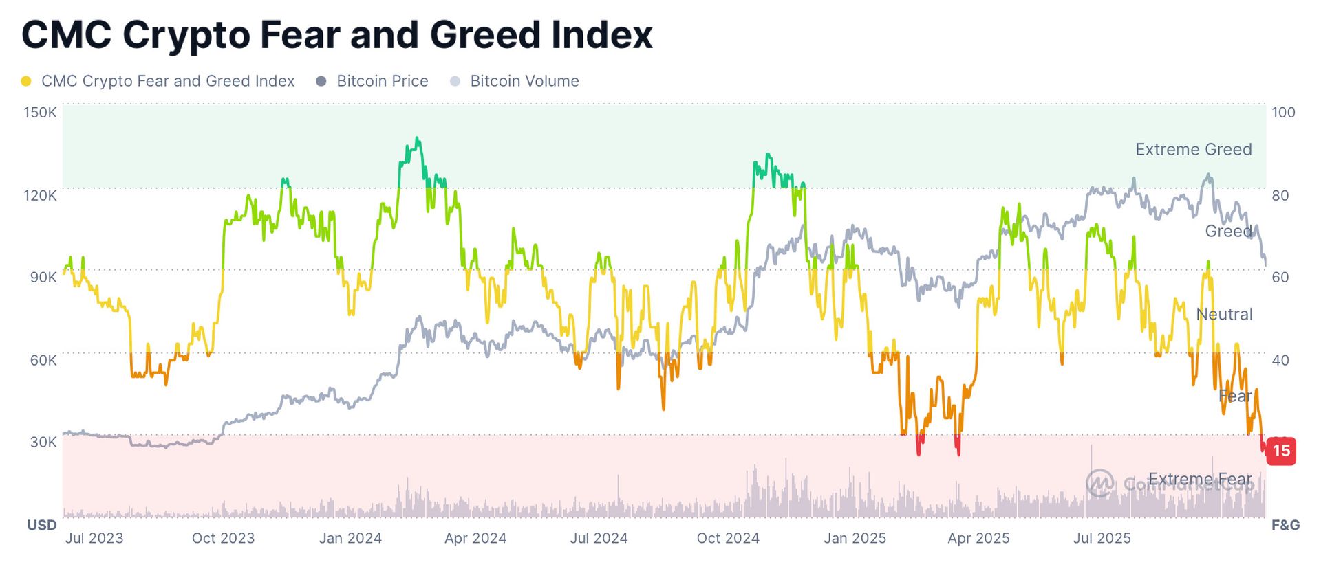 Auch der „CMC Crypto Fear & Greed Index“ von CoinMarketCap meldet mit einem Wert von 16 extrem hohe Panik im Krypto-Sektor.